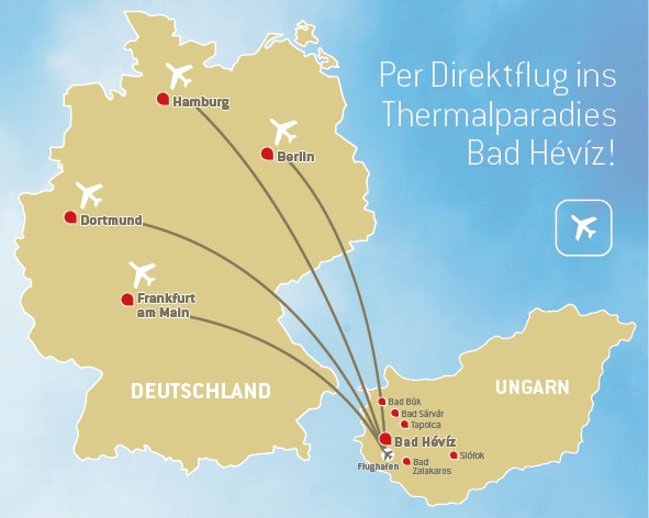 Stellen Sie sich vor: Ohne Zwischenstopp, ohne Umstieg, direkt von den Flughäfen Hamburg, Berlin, Frankfurt, Düsseldorf oder Dresden zum Flughafen Balaton bzw Hévíz Flughafen zu fliegen. Ein Luxus, den man sich heute gerne gönnt, um schneller in die Arme der wohligen Wärme des Thermalsees von Hévíz sinken zu können.